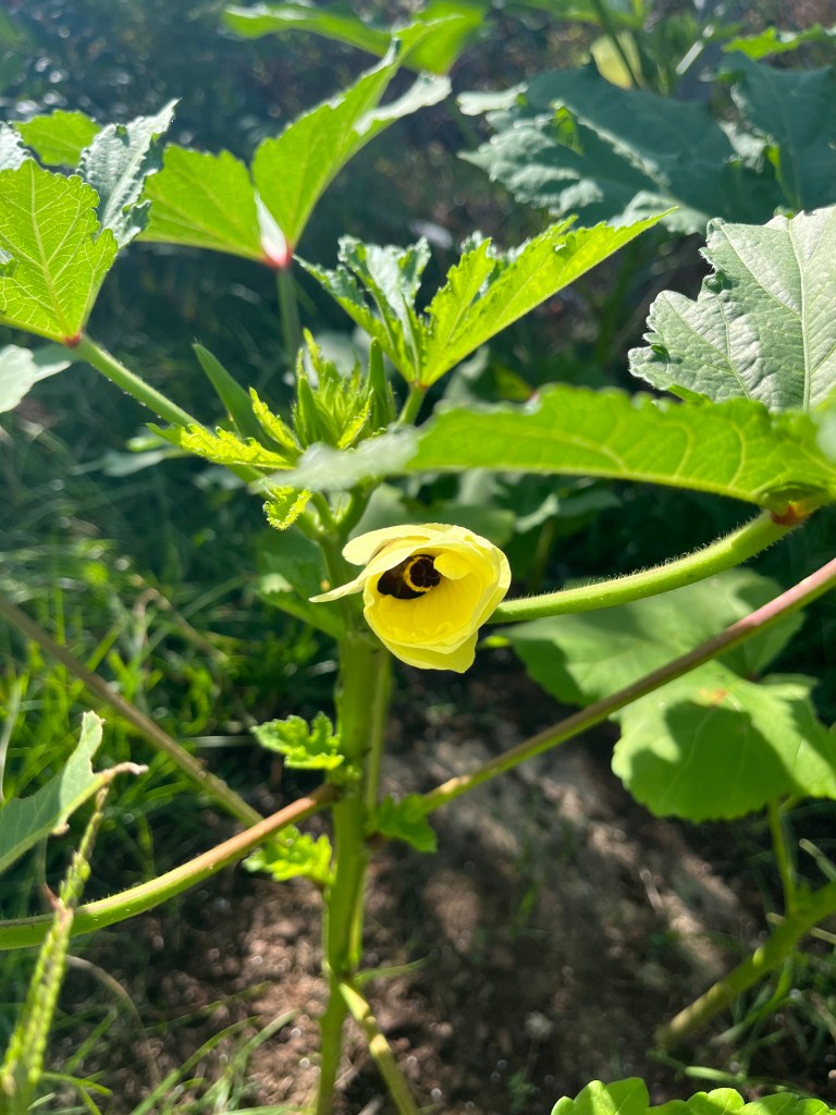 The stalks began to shoot up higher and leaves came, then the beautiful yellow flower came. And soon I had some okra.
